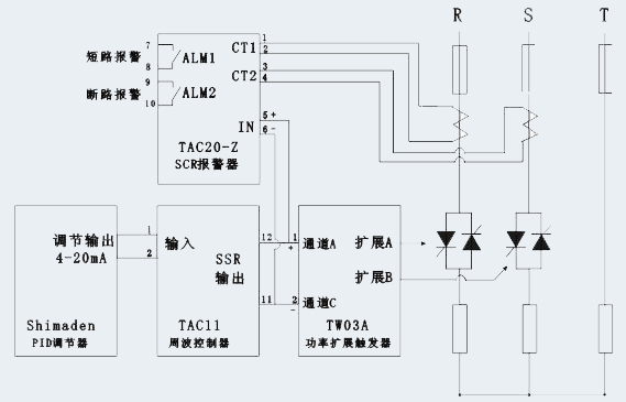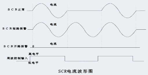 当控制输入信号为高/低平,都检测不到SCR电流,为SCR开路或加热器断线。为防止误报警,只有在连续检测出SCR断路0.5秒后,开路报警接点动作输出,同时开路报警灯亮。