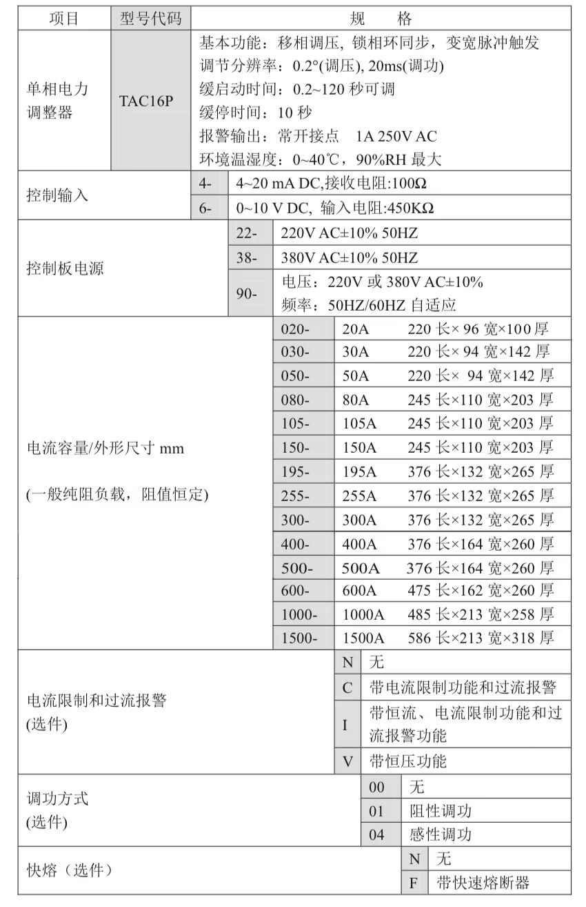 TAC16P单相电力调整器,4~20mA控制信号输入,控制板电源为220VAC或380VAC均可,频率50HZ或60HZ均可,电流容量80A(纯阻负载最大电流80A;硅碳棒负载、电热管负载最大电流62A;变压器负载最大电流53A),带恒流、电流限制功能和过流报警功能,带快速熔断器。